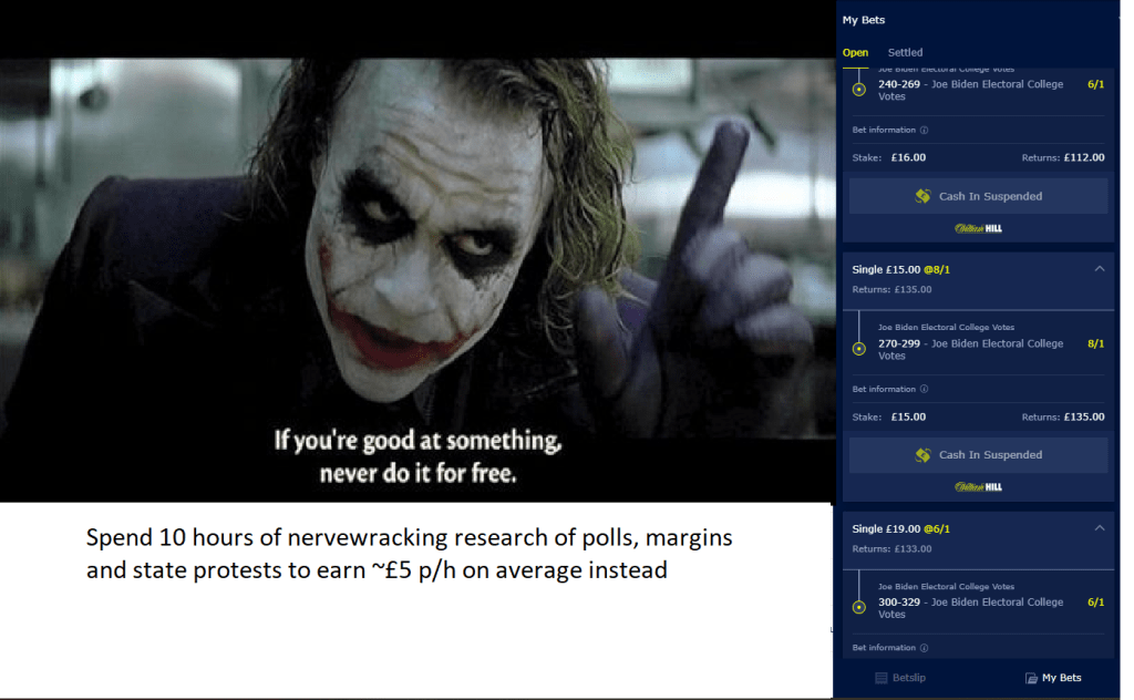 £15: 270-299 ECV’s, 8/1 odds (lol)